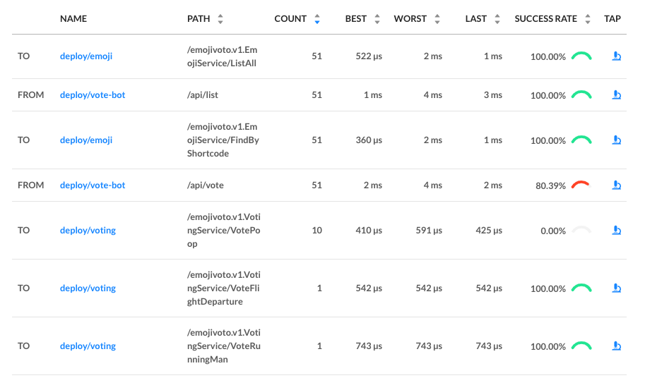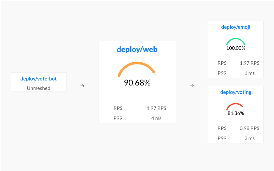 You should now be looking at the Deployment page for the web service. The first thing you’ll see here is that web is taking traffic from vote-bot (a service included in the Emojivoto manifest to continually generate a low level of live traffic), and has two outgoing dependencies, emoji and voting.