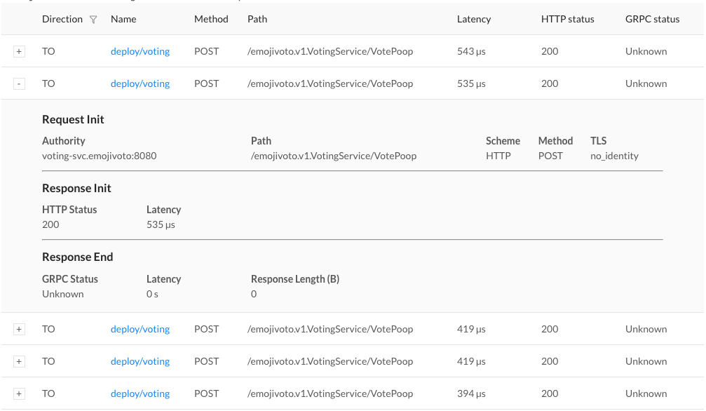 Finally, if we click on the “tap” icon for that row in the far right column, we’ll be taken to live list of requests that match this endpoint. This allows us to confirm that the requests are failing (they all have gRPC status code 2, indicating an error).