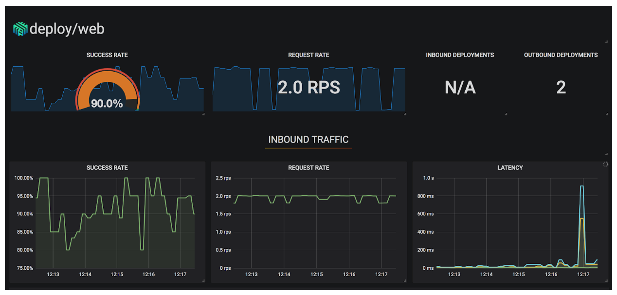 Also, did you notice the little Grafana icon on the very first page we looked at? Linkerd ships with automatic Grafana dashboards for all those metrics, allowing you to view everything you’re seeing in the Linkerd dashboard in a time series format. Check it out!